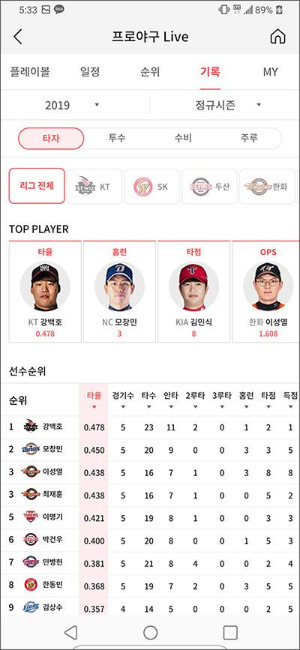 각 구단의 순위나 기록은 물론 일정까지 자세한 정보를 제공하는데, 전에 KT WIZ 앱에서 보던 정보들을 그대로 다 볼 수 있더라고요. 물론 각 구단의 앱처럼 티켓 예매나 주차장 결제 같은 건 안됩니다.