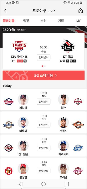 또한 스마트 중계이라는 메뉴가 있어서 경기 중의 중계를 볼 수 있는 것은 물론 그날그날 경기의 라인업과 승부 예측 정보 등 전력을 확인할 수 있는데 이건 선호 구단뿐만 아니라 타구장 정보나 중계도 볼 수 있으니 상당히 편리합니다.
