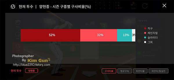 그래픽 중계라는 것이 있어서 만약 데이터 때문에 영상을 시청하지 못하거나 좀 더 정확한 데이터 정보가 필요하면 인포 그래피와 함께 정볼르 얻고 피칭이나 타구에 대한 정보를 그래픽과 함께 볼 수 있습니다. 요거 정말 좋더라고요.