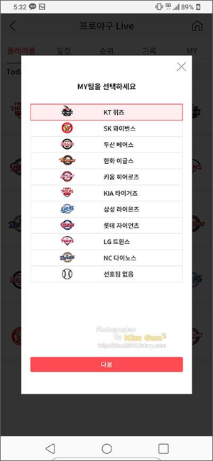프로야구 Live 메뉴에 진입하면 자신이 선호하는 팀에 대한 설정을 하게 되는데요. 경가 있는 경우 각 팀의 경기 진행 상황을 알림으로도 받을 수 있기 때문에 상당히 편리한 서비스입니다.