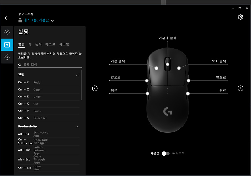 G 프로 와이어리스는 일반적인 마우스에서 자주 사용하는 5 버튼 스타일인데요. 좌수용 버튼까지 총 7개로 사용할 버튼 수도 사용자가 직접 정의할 수 있어서 빠른 입력을 지원합니다.