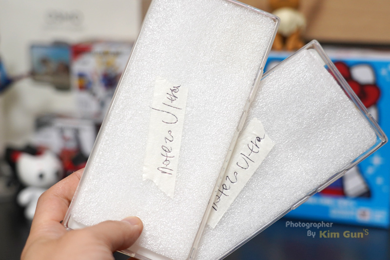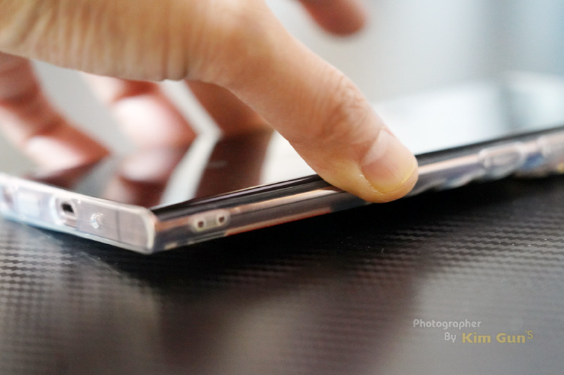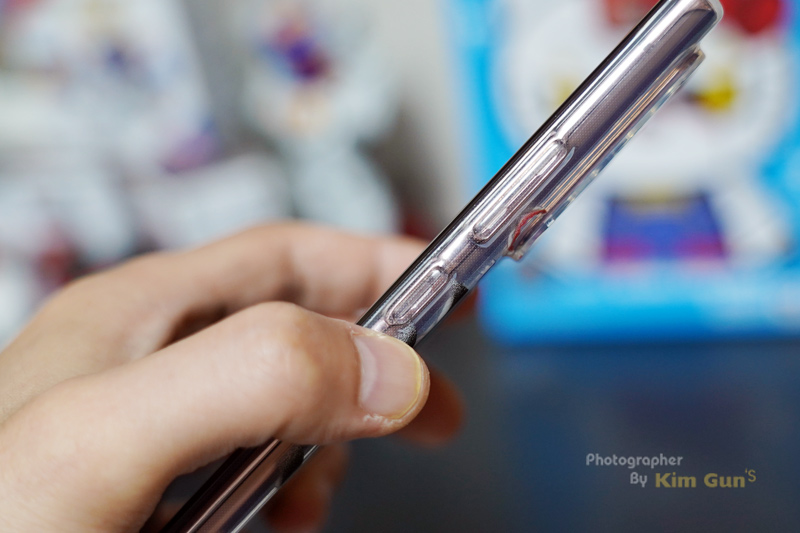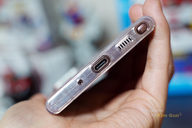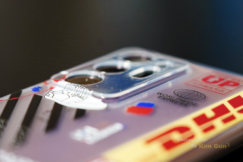 케이스는 젤리 케이스고 이렇게 카메라까지 보호하도록 되어 있습니다. 덕분에 뒷면이 약간 두꺼운 편이죠. 카메라 렌즈와 AF는 타공 되어 있어서 카메라 간섭은 없습니다.