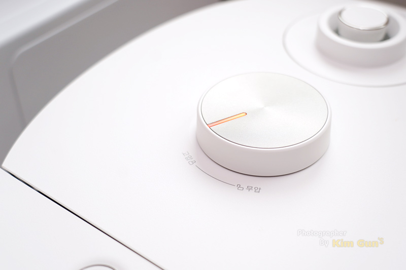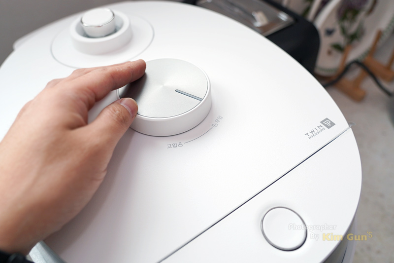 보통 상단의 다이얼은 밥솥을 잠그는 용도로 많이 쓰이는데요. 트윈프레셔는 고압과 무압을 선택하는 다이얼로 사용합니다. 물론 별도로 밥솥 뚜껑을 잠그는 다이얼은 없고 자동으로 잠가지더라고요.