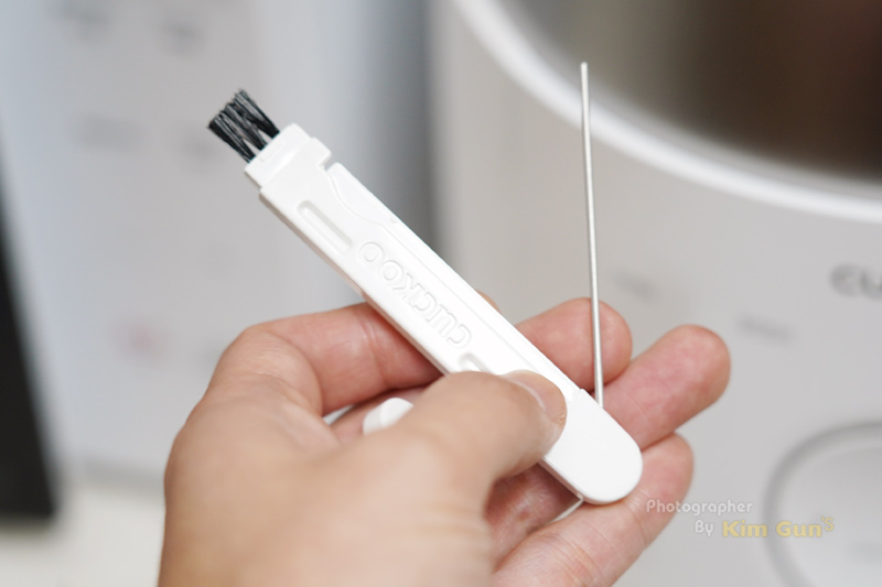 밥솥 아래에 보면 청소용 도구가 있는데요. 배수로나 증기구 청소할 때 활용하면 됩니다. 긴 꼬챙이 같은 것과 작은 솔로 되어 있는데 활용하기 좋은 것 같아요.