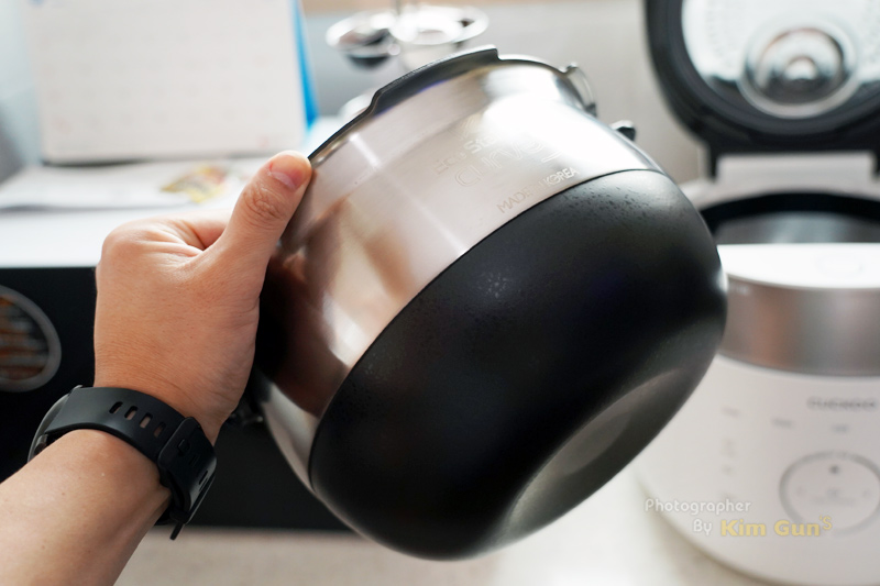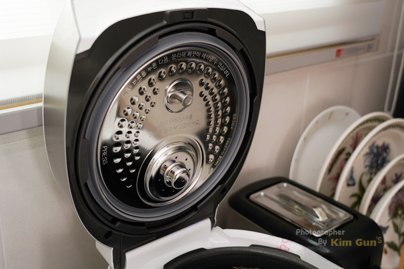 풀 스테인리스 커버를 가지고 있고 2중 패킹 구조라 압력솥 밥맛을 재현해 줍니다. 커버는 원터치로 쉽게 분리할 수 있어서 쉽게 분리해서 세척할 수 있고요.