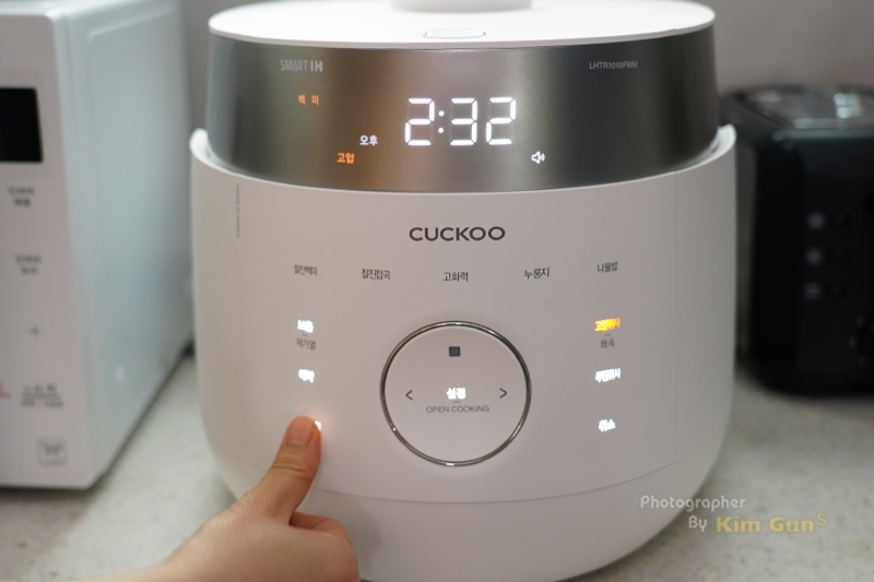 밥솥 오픈 버튼은 LED 표시창 위에 있는데요. 약간 힘을 주어 누르면 밥솥을 열 수 있습니다. 전자식으로 제어되기 때문에 쿠킹 중에는 열리지 않도록 되어 있고요.