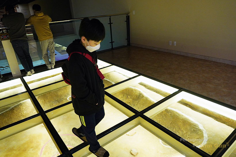 무성한 갈대 숲 사이에 작은 전시관이 있는데요. 여기는 패총 전시관으로 예전 집터를 그대로 옮겨서 만들어 놓은 곳입니다. 유리 바닥으로 되어 있어서 예전 모습을 더욱 가깝게 볼 수 있고요.