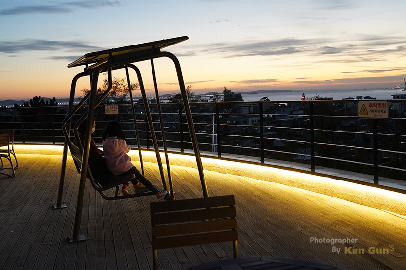 이 멋진 해넘이와 풍경을 감상할 수 있도록 의자도 있는데요. 그네 벤치가 있어서 정말 운치 있게 감상할 수 있습니다. 생긴 지 얼마 안 된 공원답게 그네 벤치도 완전 신형이더라고요. 아래 카페에서 커피 한잔 사서 올라와 있으면 좋을 듯싶은데 요즘은 겨울이라 좀 추우려나요?