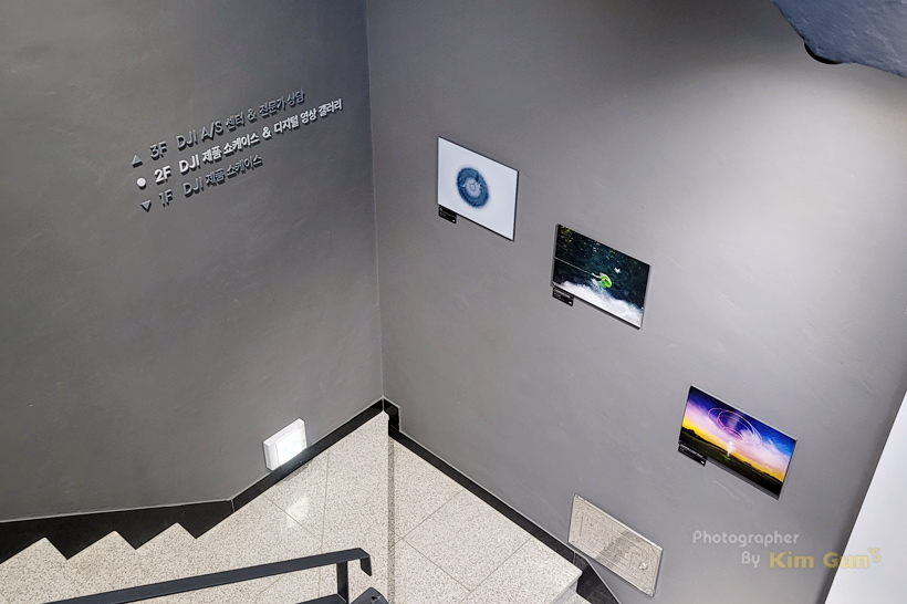 AS 센터는 플래그십 스토어 3층에 위치하고 있는데요. 엘리베이터를 이용하거나 개단을 이용해서 올라갈 수 있습니다. 그날만 그랬는지 시간 예약제라서 그런지 사람이 별로 없어서 대기 안 하고 바로 접수. 계단에 DJI 제품들을 이용해서 촬영한 사진들이 있는데, 드론으로 촬영한 사진들이 정말 멋지더라고요. 미니 2가 어서 오길 기다리고 있습니다.