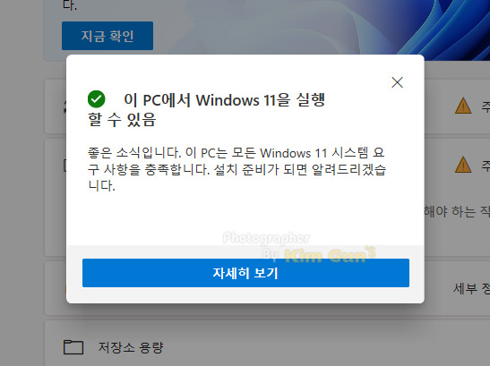 간단하게 시스템을 체크해서 Windows 11의 실행 가능 여부를 알려 줍니다. 뭐... 업그레이드를 지금 당장 할 수는 없으니 천천히 확인하고 필요한 부분은 준비해 두면 될 것 같습니다. 시스템 요구 사항이 그리 높진 않아서 웬만하면 무료 업그레이트를 받을 수 있지 않을까 싶네요.