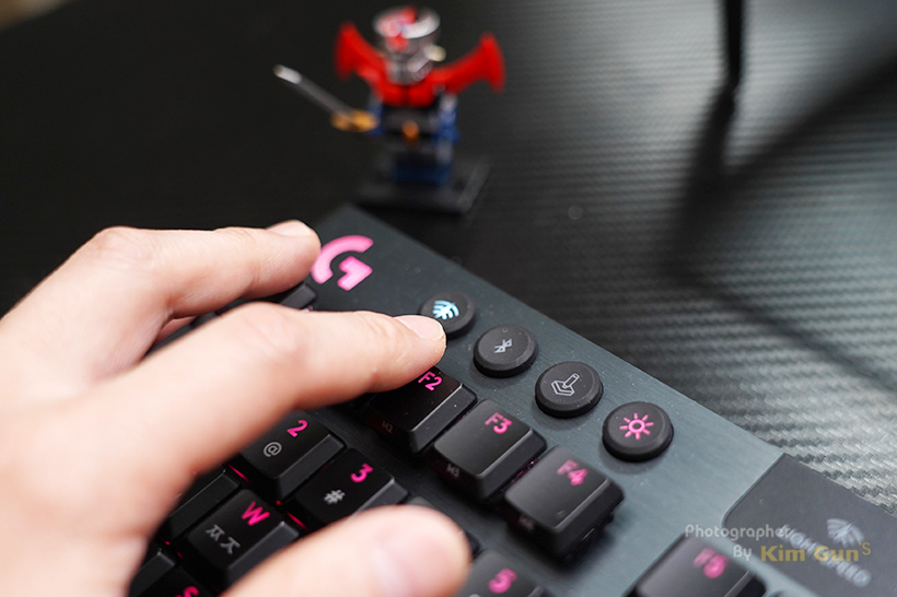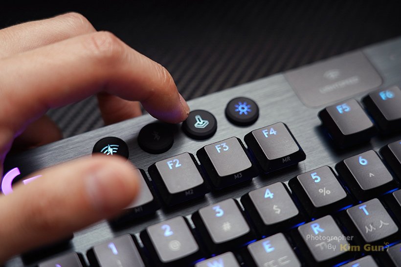 펑션키 상단에는 4개의 버튼이 있는데 LIGHTSPEED와 블루투스 연결 선택 그리고 게이밍 모드 ON/OFF와 LED 밝기 조절 버튼입니다.