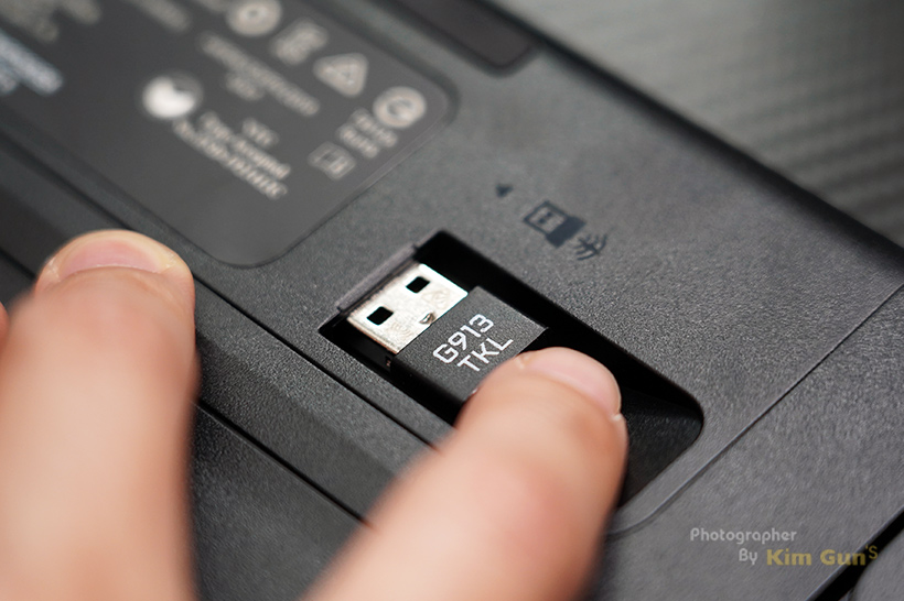 G913 TKL 하단에는 USB 수신기를 보관하는 부분이 있어서 휴대나 보관 시 USB 수신기를 잃어버리지 않도록 보관할 수 있습니다. 수신기 보관 부분이 없는 기기들이 몇 개 있는데 수신기들을 따로 보관하다 보니까 잃어버리거나 섞여서 뭐가 뭔지 모르게 되는 경우가 많더군요.