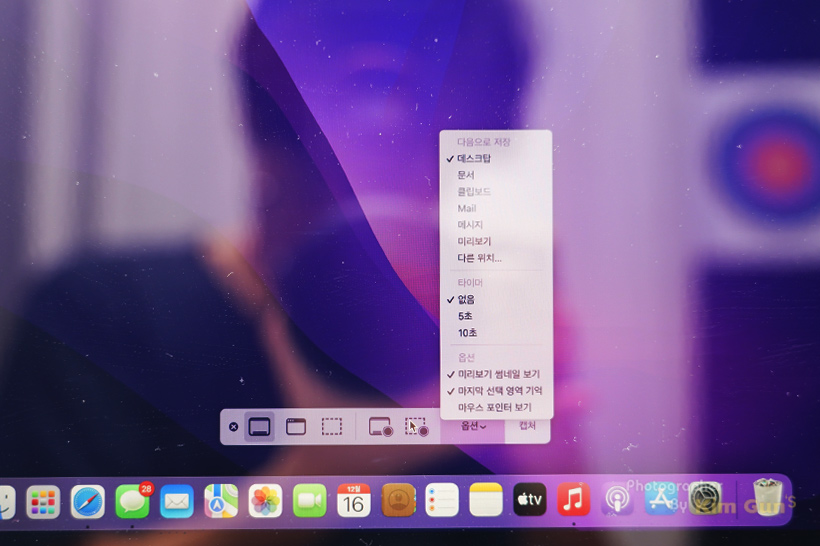 메뉴 화면에서는 다양한 옵션을 선택할 수 있는데요. 저장 위치나 미리 보기 시간 설정 등 디테일한 설정을 바로 할 수 있습니다. 옵션은 선택된 캡처 메뉴에 따라 달라지는데, 화면 녹화가 선택되면 옵션 메뉴에 맥에 내장된 마이크를 활성화할 수 있습니다.
