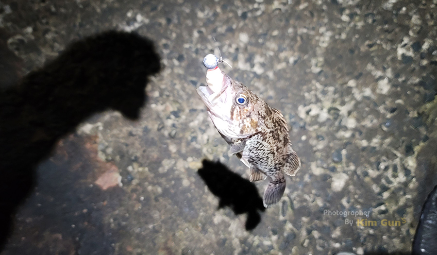 거의 만조에 들물이라 빠른 침강이 필요할 것 같아서 1/4 지그에 3인치 그럽웜 달아서 던지니 쓸만한 사이즈의 녀석들이 올라옵니다. 큰 우럭들은 작은 웜은 잘 물진 않던데 물고기들도 본능적으로 작은 먹잇감은 작은 개체들을 위해 별 신경을 안 쓰는 것 같다는 생각이 들기도 하더라고요.