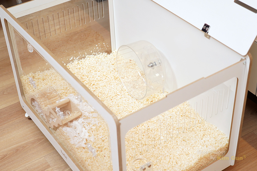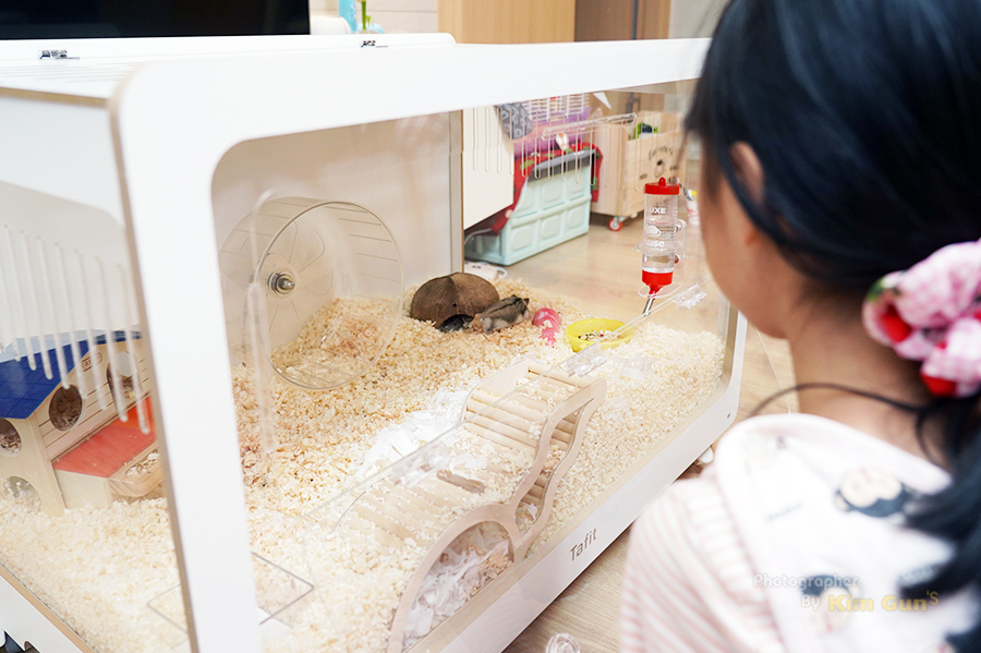앞문이 열리니까 우리 집 햄찌의 메인 집사인 2호가 무척 좋아합니다. 철제 케이지 일 때는 케이지에 가려져서 잘 보이지 않기도 하고 좀 보기가 힘들었는데 이렇게 잘 뚫려 있으니까 뭘 하는지 보기가 한결 수월해졌습니다. 앞문이 넓어서 좋네요.