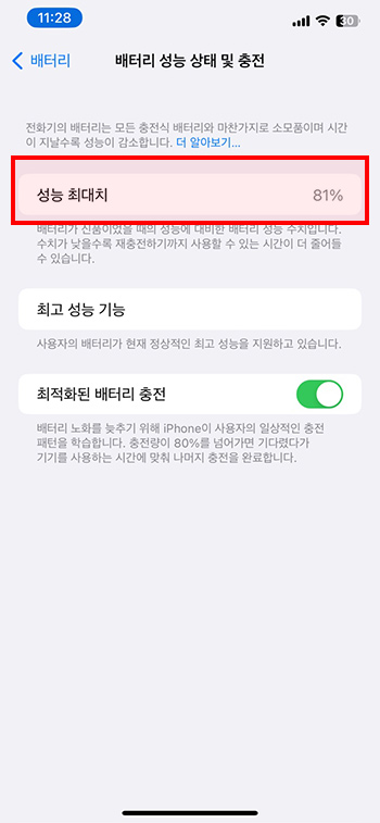 성능최대치가 중요한 게 만약 1년 사용한 아이폰을 구입한다고 했을 때 굉장히 하드 하게 사용한 경우는 그만큼 배터리 교체 주기가 짧아지기 때문에 감가상각의 요인이 되기도 하니 중고로 구입하거나 판매할 때 가격을 정하는 기준이 되기도 합니다.