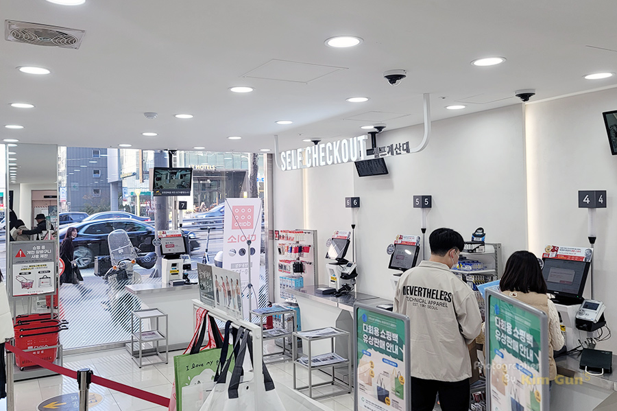 대부분의 다이소가 그렇듯 1층에는 시즌상품과 계산대가 준비되어 있습니다. 요즘 다이소는 셀프 계산대로 운영돼서 결제 시간을 줄일 수 있는 장점이 생기기도 했죠. 계산대가 꽤 많아서 사람이 좀 몰려도 대기 시간이 길진 않을 것 같습니다.