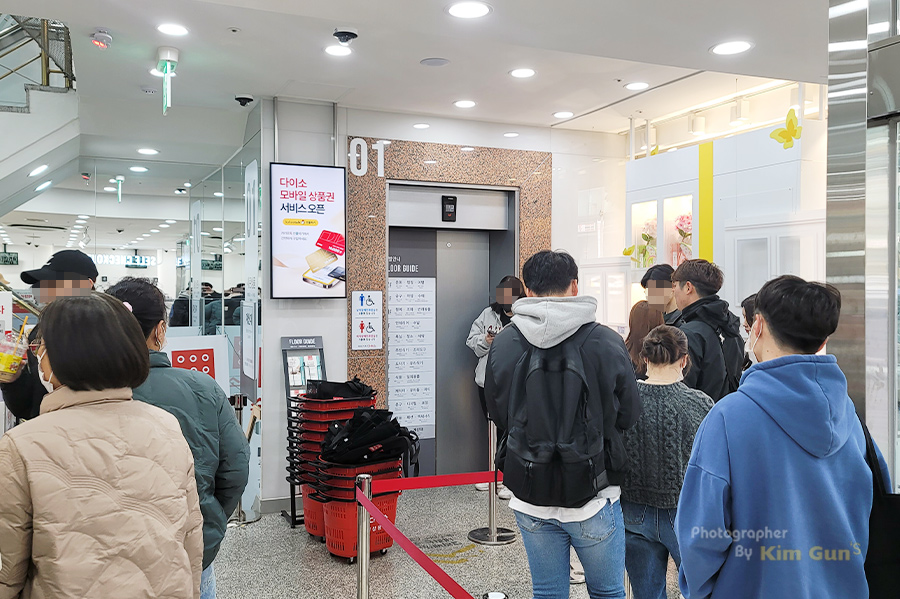 12층을 전부 돌아보려면 엘리베이터로 12층까지 가서 내려오면서 보는 게 가장 좋은데요. 엘리베이터가 크진 않기 때문에 대기줄이 좀 있습니다. 제가 평일 낮에 갔는데도 사람이 좀 많았는데, 주말에는 정말 사람 많을 것 같아요. 쇼핑 바스켓과 바구니는 층마다 다 있으니까 굳이 1층에서 들고 올라가지 않아도 됩니다.